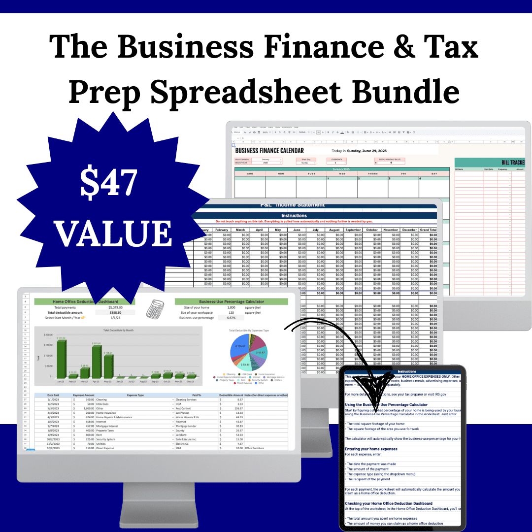 The Business Finance & Tax Prep Spreadsheet Bundle Take control of your business finances and simplify tax season without the stress or spreadsheet overwhelm. Designed for small business owners, freelancers, & online entrepreneurs, this easy-to-use bundle includes everything you need to track your income, organize expenses, and stay on top of tax deadlines, in one place.